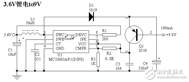 自制鋰電3.7v升9v電路圖(一)